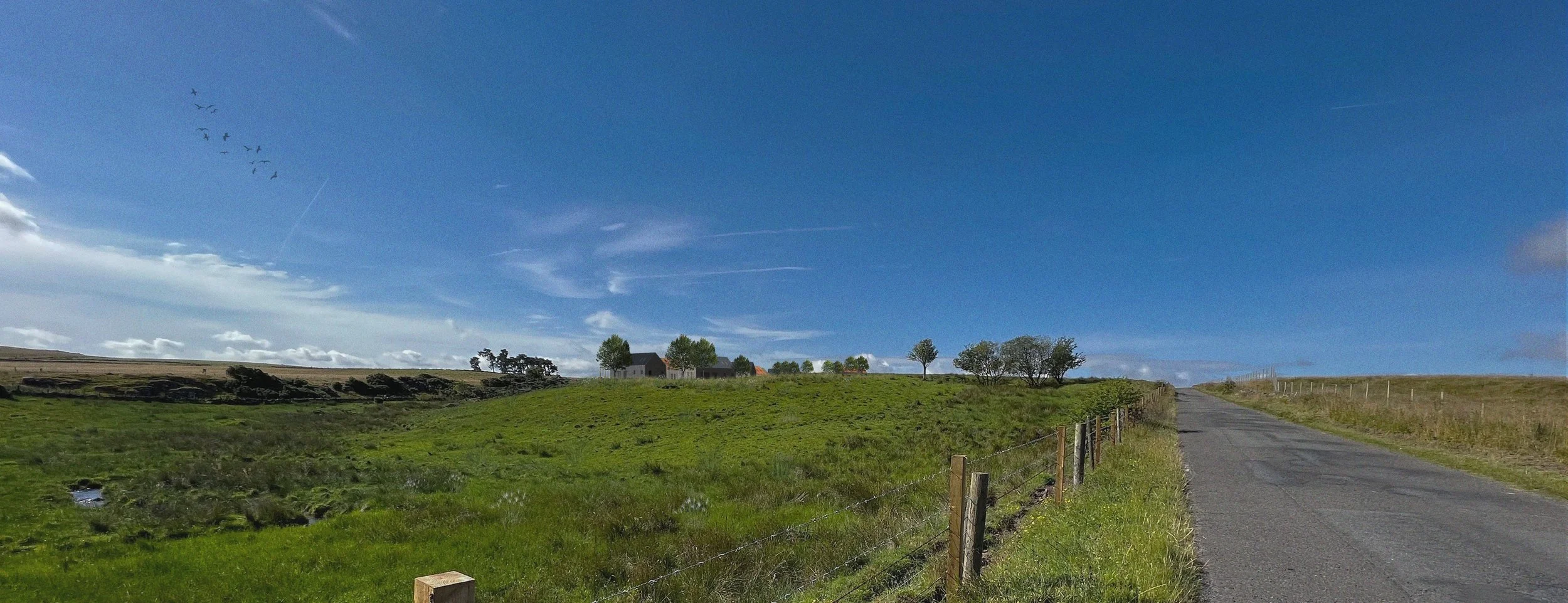 The proposal remains respectful to the recognisable rural context adopting simple massing, form and materiality, making reference to rural agricultural buildings and farm clusters. The proposed buildings are obedient to the site contours seeking to nestle into the low Eastern boundary of the site with the intention of remaining largely obscured from the approaches, and reducing skyline impact